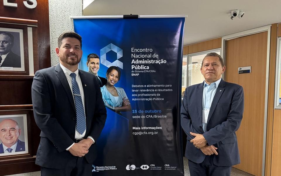 O conselheiro do CRA-CE, Adm. Marcos Izequiel — coordenador da Câmara de Gestão Municipal e diretor administrativo-financeiro do Conselho — representou o regional no 1º Encontro Nacional de Administração Pública, realizado na sede do Conselho Federal de Administração (CFA), em Brasília, no dia 15 de outubro de 2025. Ele esteve acompanhado do administrador Vaval Cardoso, chefe de gabinete da prefeita de Pacatuba, Larissa Camurça.